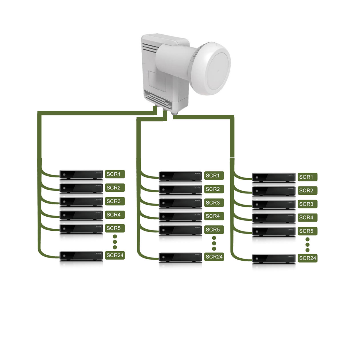 Denna Unicable II™ LNB möjliggör installationer med upp till 24 satellitmottagare anslutna via en enda koaxialkabel och som använder EN50494/EN50607-protokollen, vilket ger tillgång till ett obegränsat antal transpondrar.
