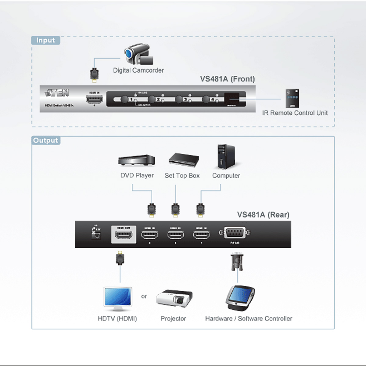 - Strömdetektion – om en av HDMI-källorna är avstängd växlar VS481A automatiskt över till nästa påslagna enhet